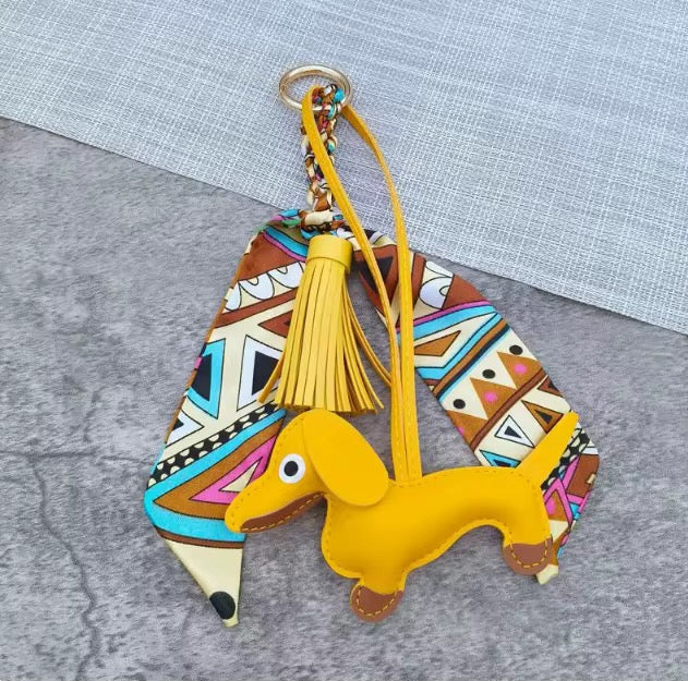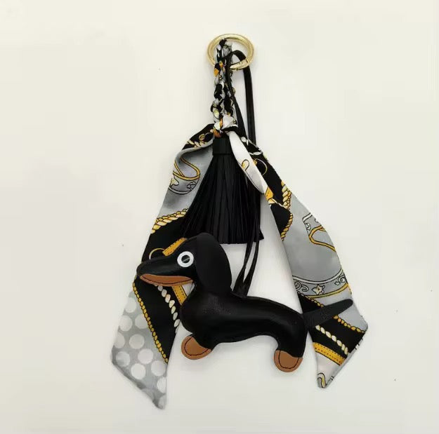 Introducing our Dashing Dachshund Bag Charm! This enchanting accessory exudes elegance and charm, adorned with a scarf, dachshund, and fringe. It's the perfect addition to elevate your handbag.